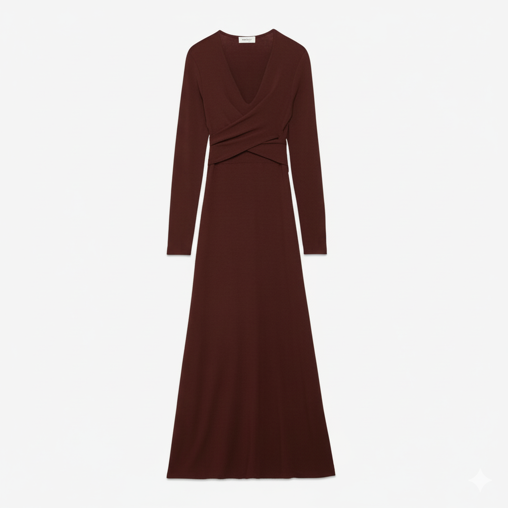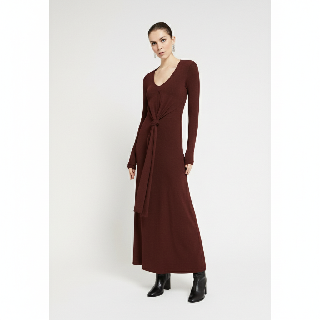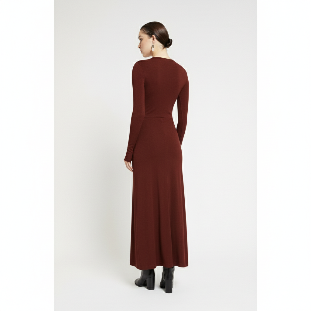 Abito lungo in puro jersey di viscosa elasticizzata con pinces e scollo a V, un capo elegante e senza tempo che unisce comfort e raffinatezza.