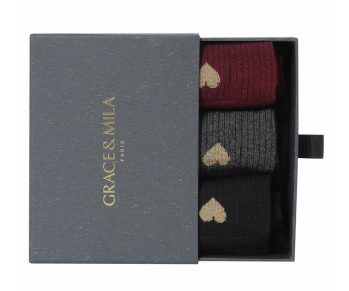 SHELBY è il set di calzini che unisce comfort e stile in un dettaglio unico. La maglia a costine multicolor, nei toni bordeaux, nero e antracite, incontra la brillantezza di un cuore in lurex dorato che illumina ogni look.