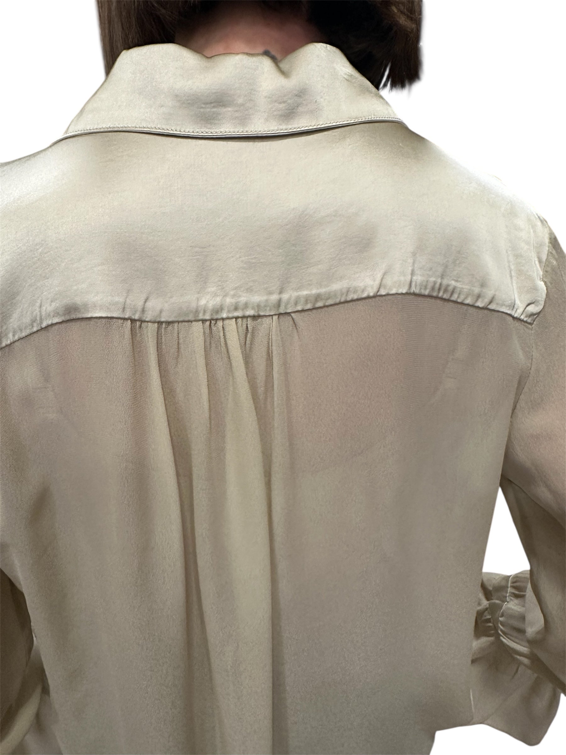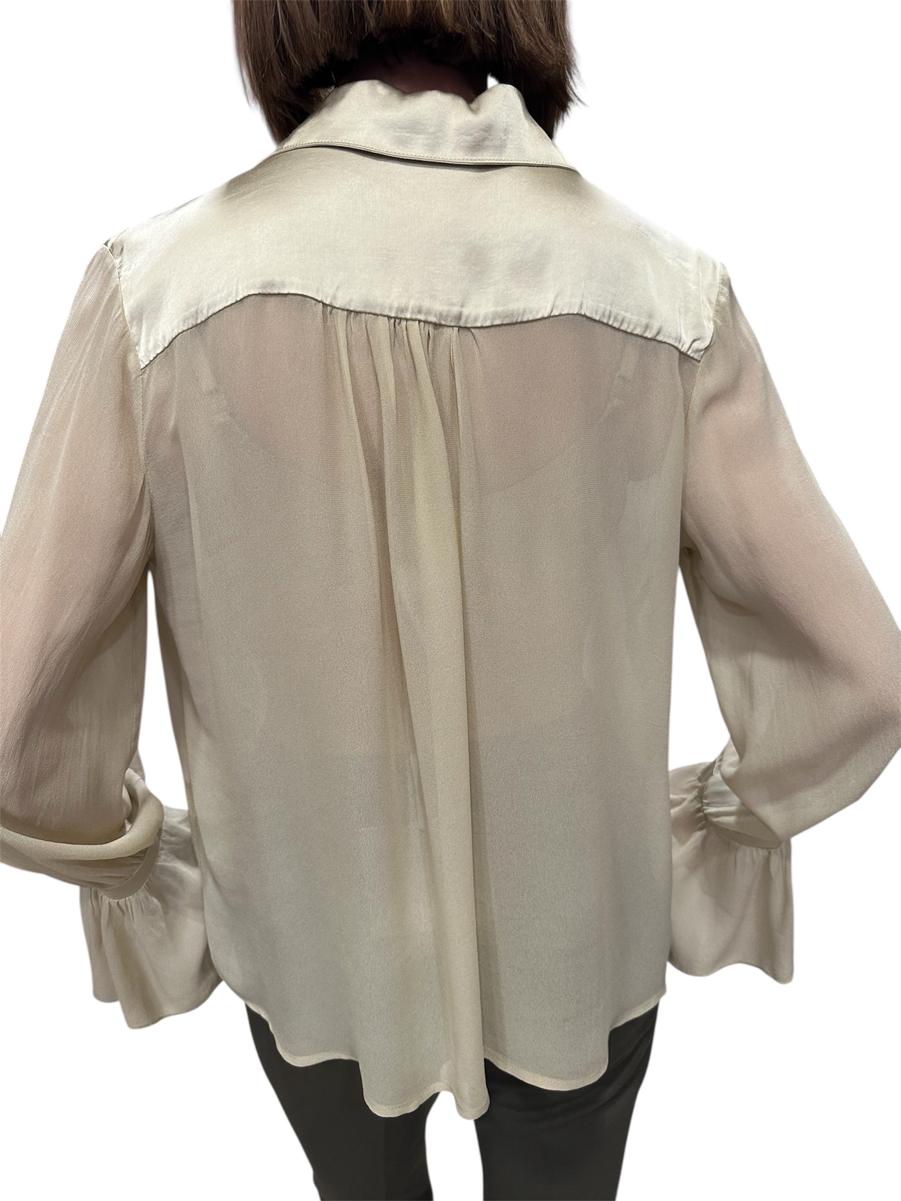 Questa camicia in pira viscosa , unisce eleganza fluida e dettagli sofisticati per un look femminile e ricercato . Il tessuto leggero e naturalmente lucente , scivola delicatamente sul corpo , offrendo una vestibilità comoda e raffinata . Le maniche a trombetta donano movimento e un tocco romantico , mentre i pregiati inserti in raso , applicati su collo , polsini e corre sulla schiena , creano un raffinato contrasto di texture , aggiungendo lice e carattere al capo . Il taglio è morbido ma definito , perfetto da indossare sia dentro che fuori dai pantaloni o gonne a vita alta . Un capo versatile che si adatta con eleganza a un look da ufficio , occasioni speciali o outfit serali , offrendo sempre un'eleganza sobria ma distintiva .