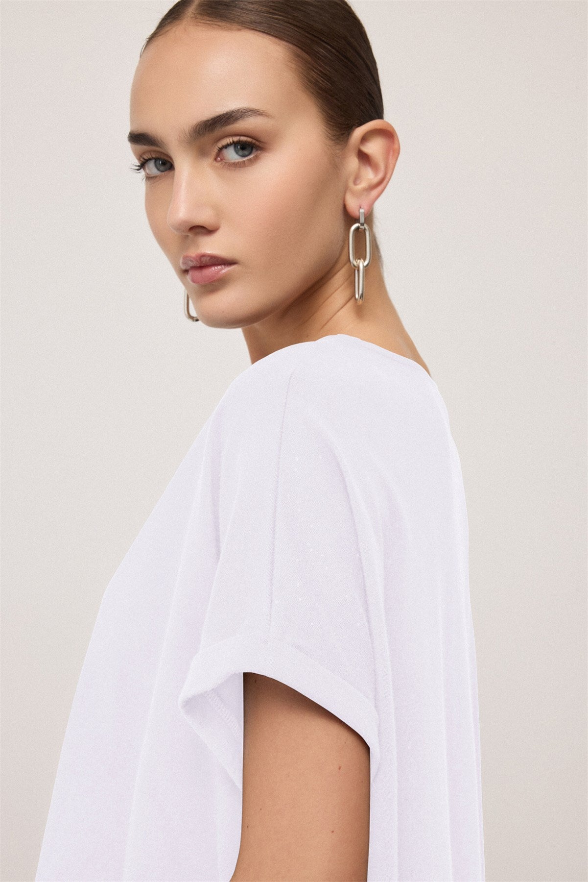 Il collo rotondo pulito, le maniche corte e il taglio dritto la rendono perfetta da indossare da sola o come layer sotto una giacca, un blazer o un cardigan. Un capo versatile che si abbina con tutto: jeans, pantaloni sartoriali, gonna midi o bermuda.