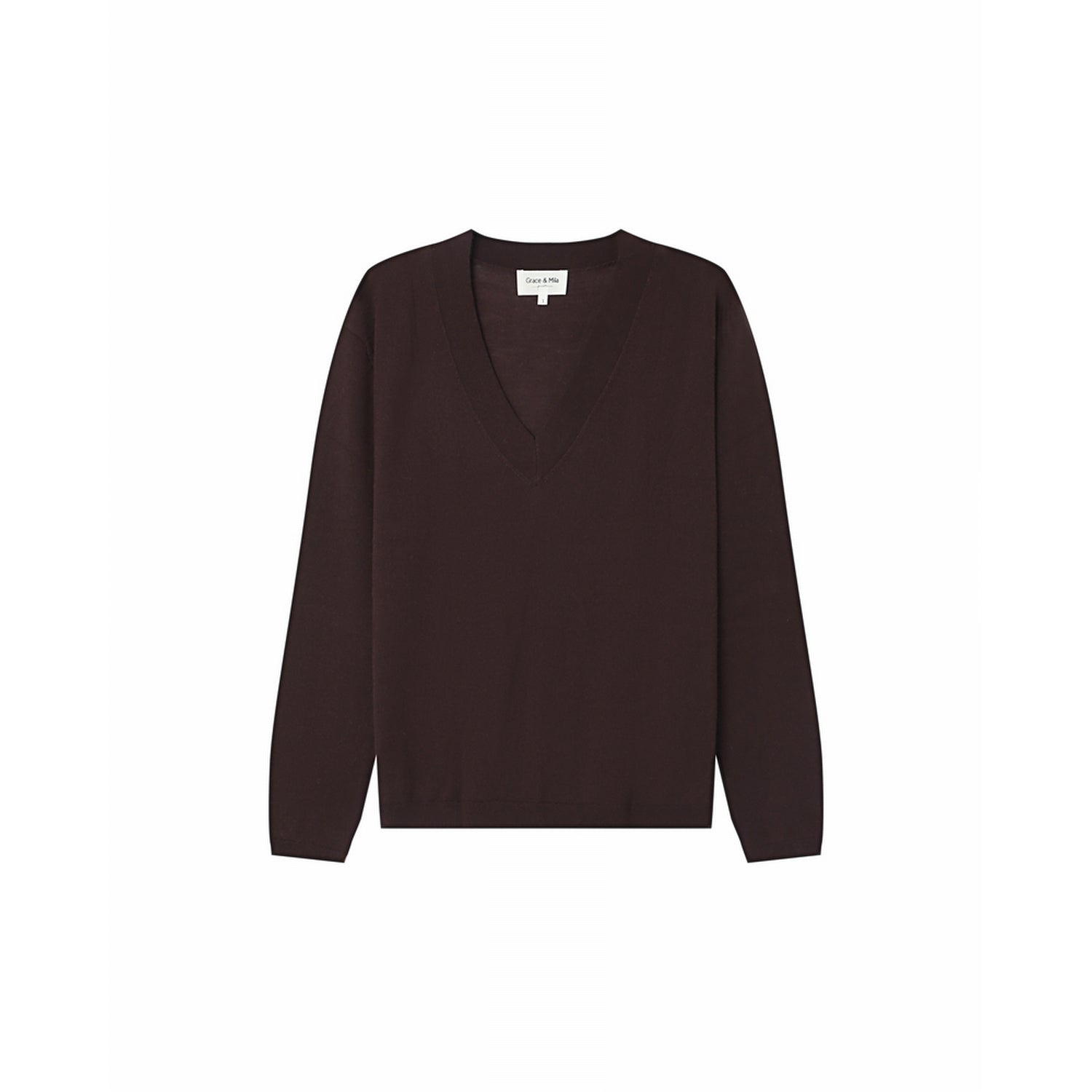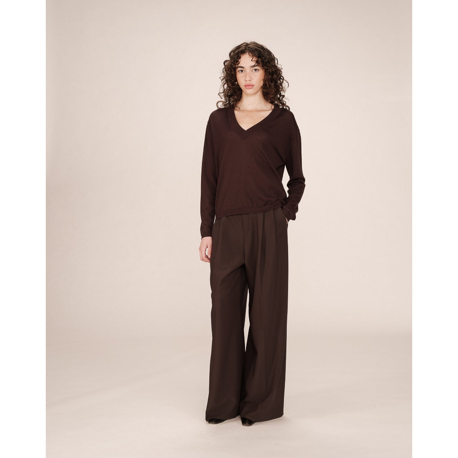 SABBA è un maglione in maglia fine realizzato in pura lana merino, leggero ma caldo e piacevole sulla pelle. La linea ampia e le maniche lunghe garantiscono comfort e libertà di movimento, mentre il profondo scollo a V dona un tocco elegante e femminile.
